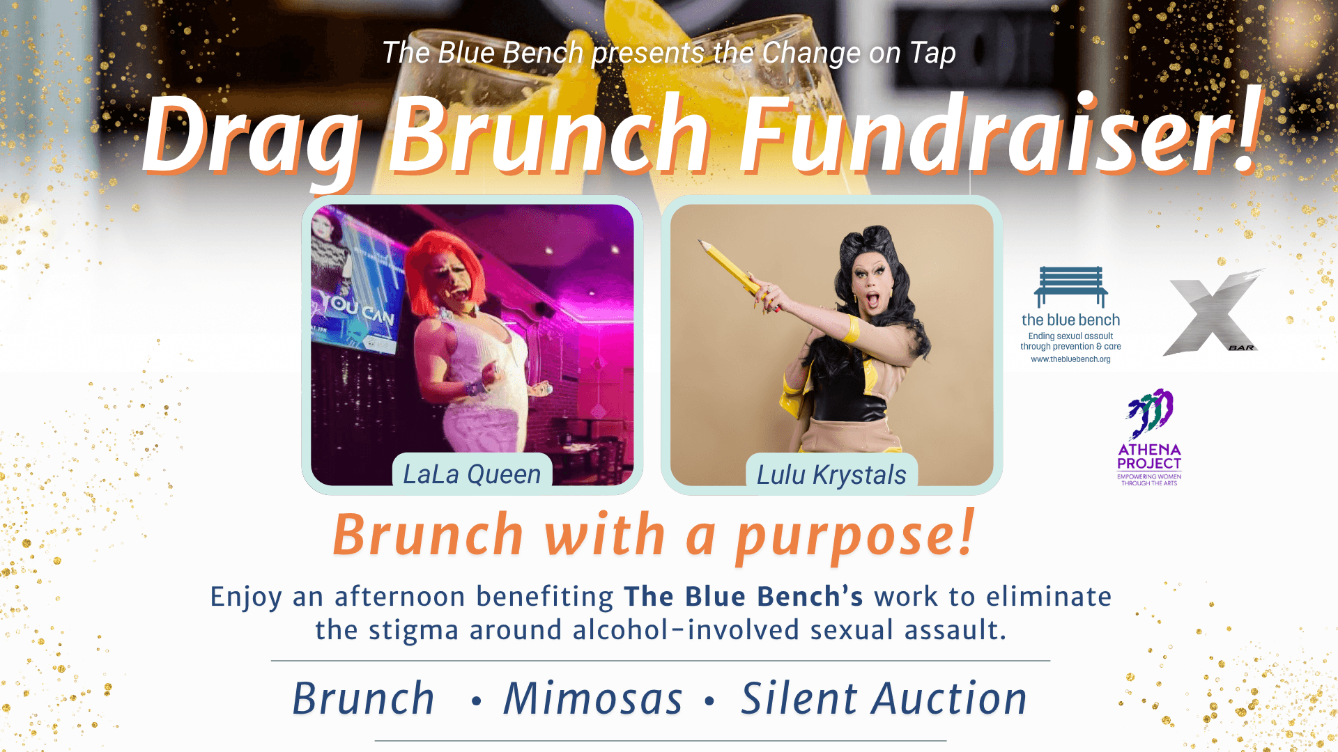 On November 8th, we're taking over X Bar from 12:00 to 2:00 PM for a dazzling drag brunch in honor of The Blue Bench's Change on Tap awareness campaign.